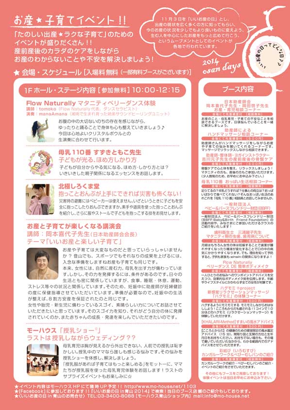 11/8(土)「いいお産の日in青山 2014」に参加します 2014年11月3日 by hugmomi Leave a comment Tweet快適お産・おっぱいライフ「いいお産の日in青山 2014」 日時:2014年11月8日(土) 10:00~12:15 会場:東京ウィメンズプラザホール https://www.tokyo-womens-plaza.metro.tokyo.jp/contents/map.html <入場無料> 詳細WEB⇒http://mo-house.net/1103/aoyama.html お知らせ