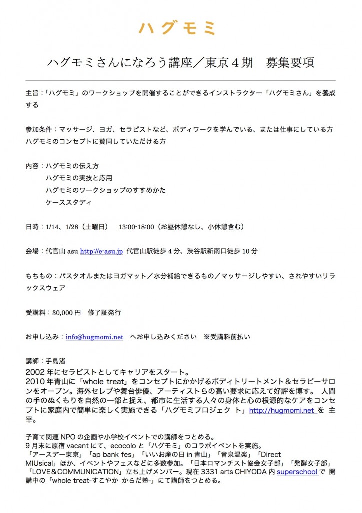 お申し込み:info@hugmomi.net へお申し込みください ※受講料前払い