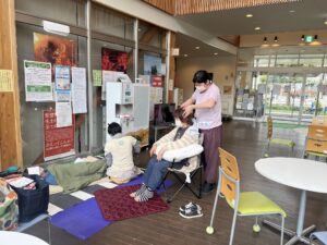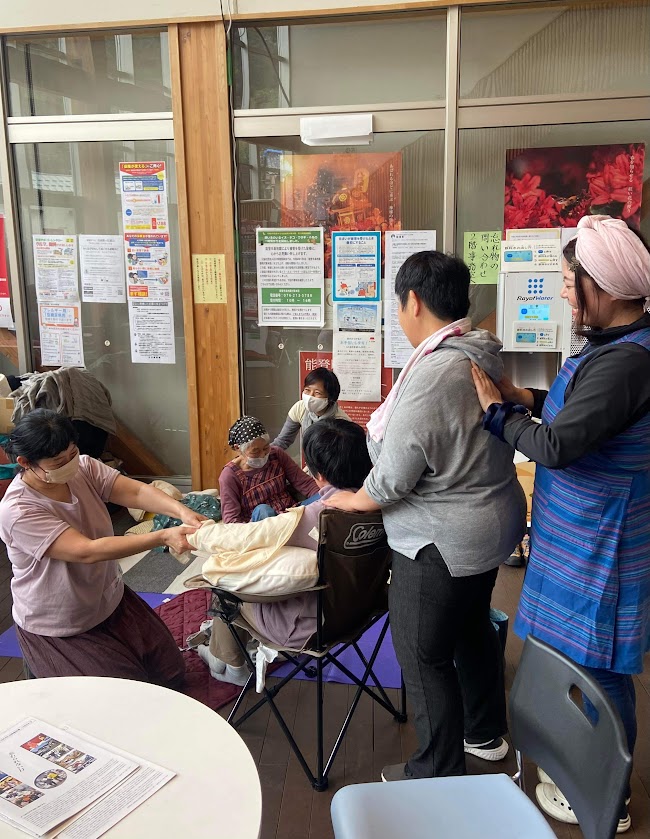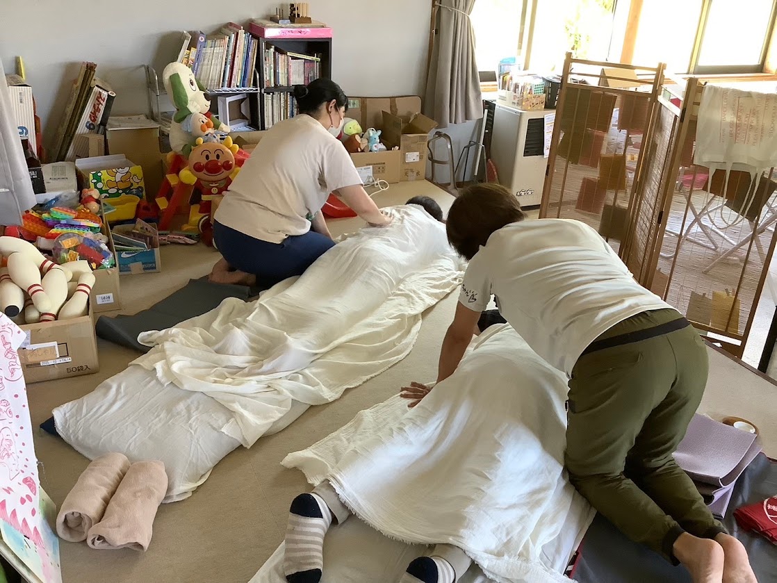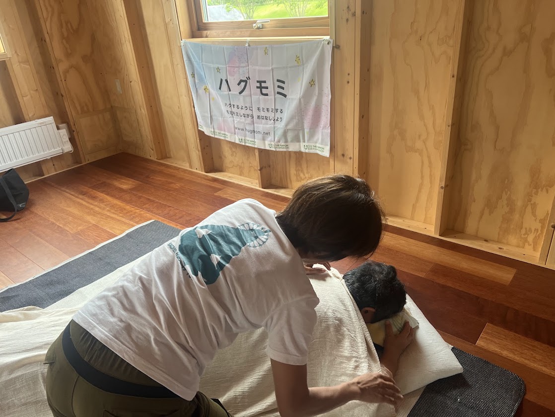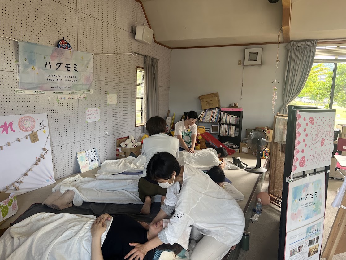 わたしたちハグモミprojectの活動の大きな転機になったのが、東日本大震災(2011年)でした。あのとき、不安な夜を過ごしているみなさんに、少しでも心おだやかな時間を過ごし、からだを休めてもらいたいと、twitterでハグモミの動きをシェアしました。それが、どれだけの役に立ったのか、それはいまでもわかりませんが、その後、実際に東北へ何度か赴き、ハグモミを体験してもらったときには、たくさんの方に、からだをほぐし、こころを落ち着かせるのに役に立つと、喜んでいただけました。身近にある、すぐそばにある大切な手が何よりの手当てとなりますように。